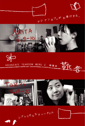 アジアンカフェがお送りする、シアトリカルなティータイム 「ASIANCAFE tea room menu2 靴音」 第二回目のテーマは、靴音。 そして初めてとなる東京での公演。 tokyo ⇔akita をつなぐ、靴音のリズム・・・ えらびぬいた珠玉の物語を さまざまなメロディに乗せて、お届けします。 ◎東京公演 出演:岡野千帆/牛込亜紗子/佐藤靖子/野村登紀江 日時:5月19日(土)、20日(日) 開場:18:30 開演19:00~(途中ティータイム休憩あり) 場所:高円寺書林 http://kouenjishorin.jugem.jp/ 東京都杉並区高円寺北3-34-2 TEL:03-6768-2412 チケット:¥1000 ・お茶つき 予約制(20席) ●予約受付中(4/19START) メールで:予約希望日、希望枚数、氏名、連絡先(Telかメールアドレス)をご記入し、asiancafe_mail@yahoo.co.jp までお送りください。 お電話で:080-6592-3087 佐藤まで 予約フォームはここをクリック http://soda.candybox.to/asiantearoom/postmail/postmail2.php ◎秋田公演 出演:高橋志保/鎌田心子/中岡宙子 最上優理子/藤田真美子/畠山泰代 日時:6月9日(土)、10日(日) 開場:14:30/17:30 開演:15:00/18:00 場所:ココラボラトリー http://cocolab.net/ 秋田市大町3丁目1-12川反中央ビル1F TEL:018-866-1559 ※専用駐車場はございません。ココラボラトリー向かい側に 有料駐車場がございますのでそちらをどうぞ。 チケット:¥1000 ・お茶つき 予約制(30席) ●予約、5/7~開始。 予約フォームはここをクリック http://soda.candybox.to/asiantearoom/postmail/postmail2.php といった感じで東京と秋田と、二カ所で開催するわけです。同じアジアンでも出る役者、演出はまったく違うので、二カ所で4度くらいおいしい。旅行がてらどちらにも足を運んでいただけるとものすごく喜んじゃいます。どうぞよろしく。 アジアンカフェってなんぞ? とおいう方はこちらをどうぞーーーー。 http://asiancafe.fem.jp/
